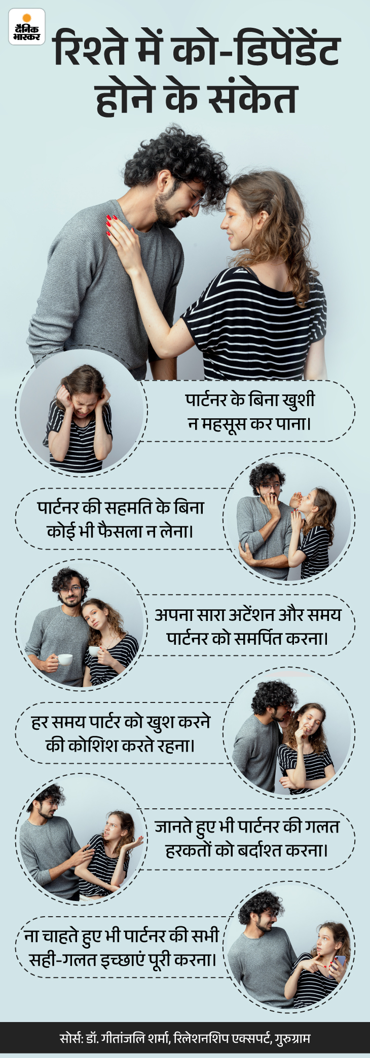 को-डिपेंडेंट रिलेशनशिप में व्यक्ति हमेशा पार्टनर की जरूरतों को ज्यादा महत्व देता है। वह उसके व्यवहार को कंट्रोल करने की कोशिश करता है। उसे पार्टनर की हर समस्या अपनी लगती है। वह हर समय खुद को सही साबित करने में लगा रहता है। अगर आपमें या आपके पार्टनर में ये संकेत हैं तो आप को-डिपेंडेंट रिलेशनशिप में हो सकते हैं। इसके अलावा रिश्ते में को-डिपेंडेंसी के और भी कुछ संकेत हैं। इसे नीचे दिए ग्राफिक से समझिए-
