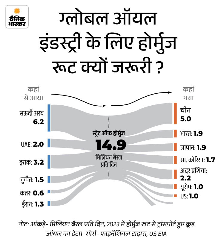 ईरान ने ‘स्ट्रेट ऑफ होर्मुज’ को ब्लॉक कर दिया है, जहां से दुनिया की 20% तेल सप्लाई होती है। वहीं, भारत अपनी जरूरत का 50% कच्चा तेल और 54% एलएनजी इसी रास्ते से मंगाता है, लेकिन वर्तमान हालात को देखते हुए भारत ने अपनी रणनीति बदल ली है और इस विवादित रास्ते पर निर्भरता कम कर दी है। वहीं, भारतीय कंपनियां जल्द से जल्द अपना स्टॉक भरना चाहती हैं।