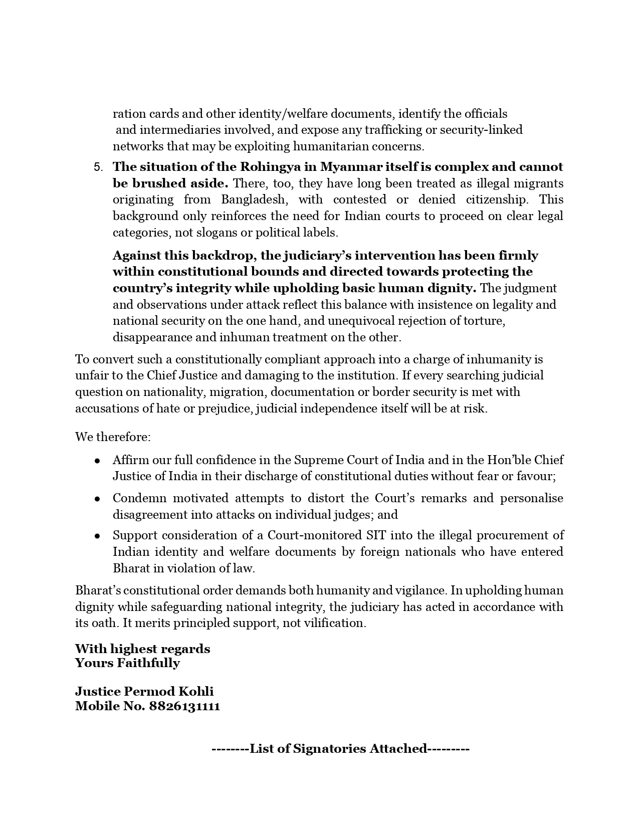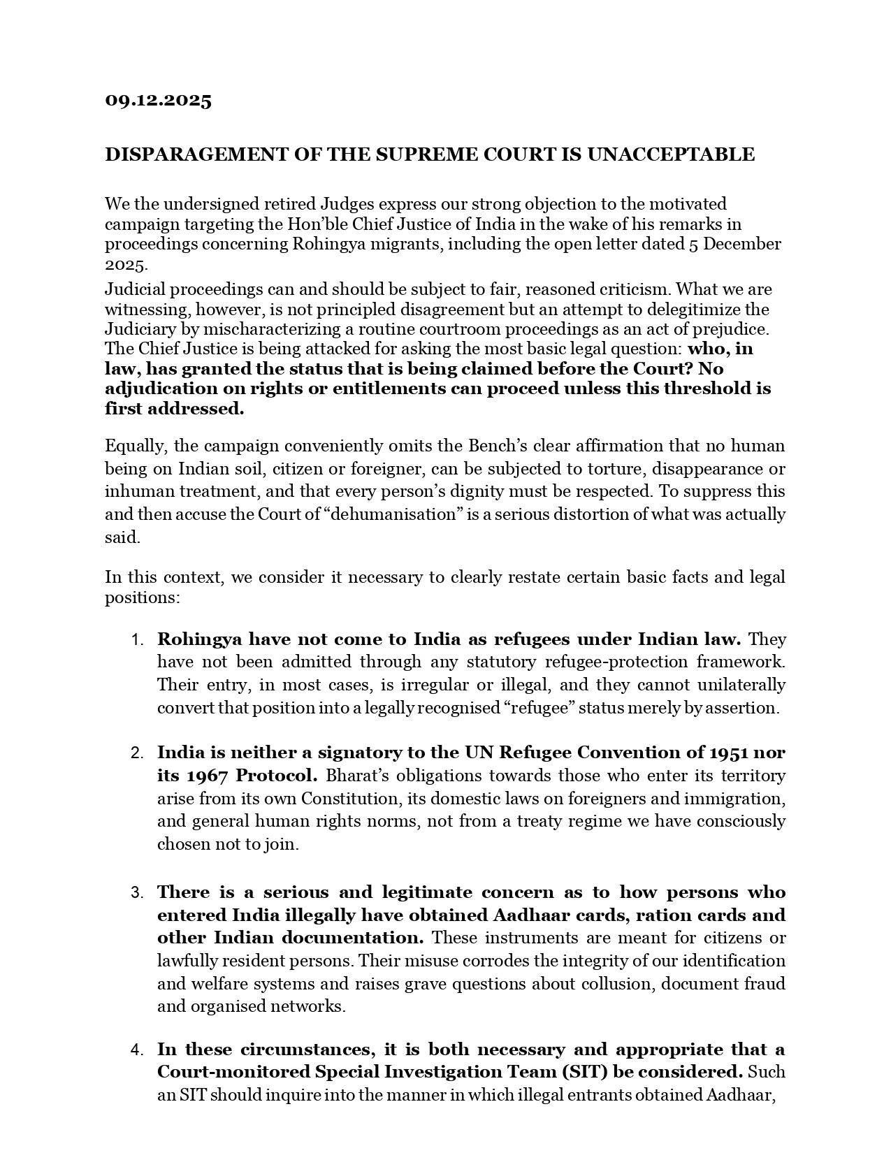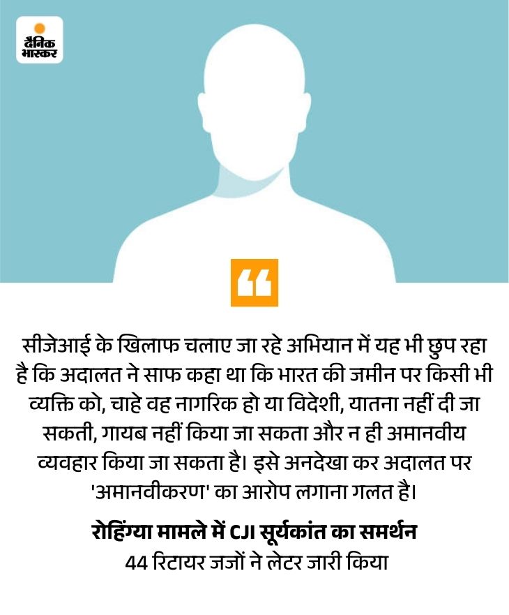 हम रिटायर जज रोहिंग्या प्रवासियों के मामले में सीजेआई सूर्यकांत की टिप्पणी के खिलाफ चलाए जा रहे गलत अभियान पर कड़ी आपत्ति जताते हैं। आलोचना हो सकती है, लेकिन यह अभियान न्यायपालिका की छवि खराब करने की कोशिश है।