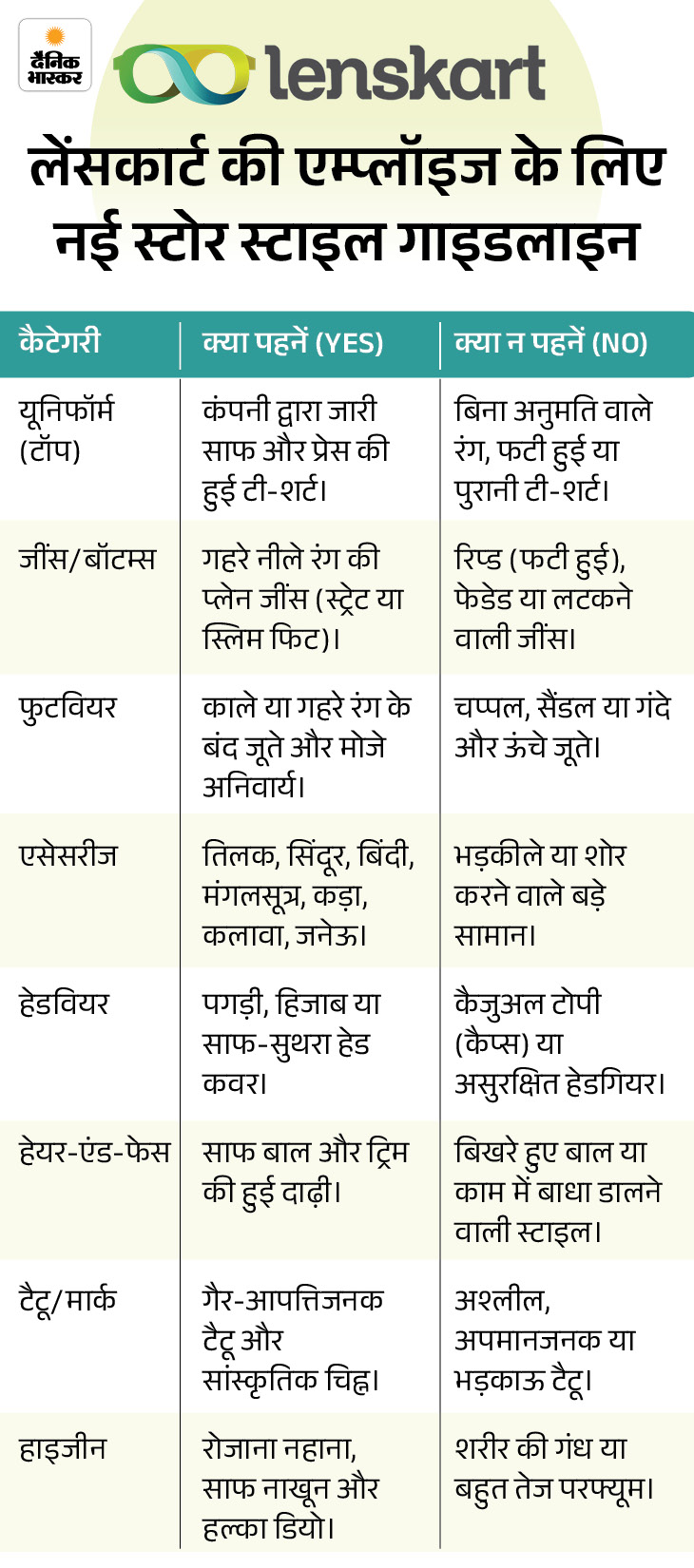लेंसकार्ट अपने ड्रेस कोड को लेकर विवादों में घिर गई है। सोशल मीडिया पर कंपनी का एक कथित पॉलिसी डॉक्यूमेंट वायरल हुआ है। इसमें कर्मचारियों को बिंदी, तिलक और कलावा पहनने से मना किया गया है, जबकि हिजाब और पगड़ी को शर्तों के साथ मंजूरी दी गई है।