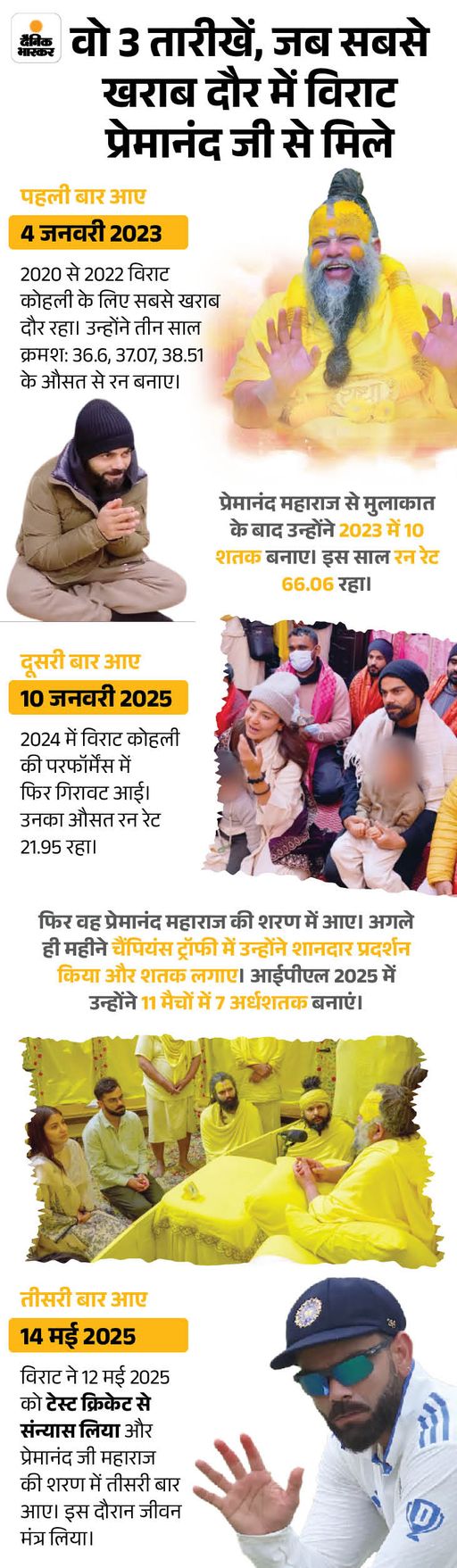 क्रिकेट से संन्यास लेने की घोषणा के बाद संत प्रेमानंद महाराज से मिले थे विराट ने 7 महीने पहले टेस्ट क्रिकेट से संन्यास लेने की घोषणा की थी। घोषणा करने के अगले दिन अनुष्का के साथ प्रेमानंद महाराज के आश्रम पहुंचे थे। विराट और अनुष्का ने वृंदावन के केली कुंज आश्रम में 15 मिनट तक प्रेमानंद महाराज से बात की थी। आश्रम में करीब ढाई घंटे रहे थे।