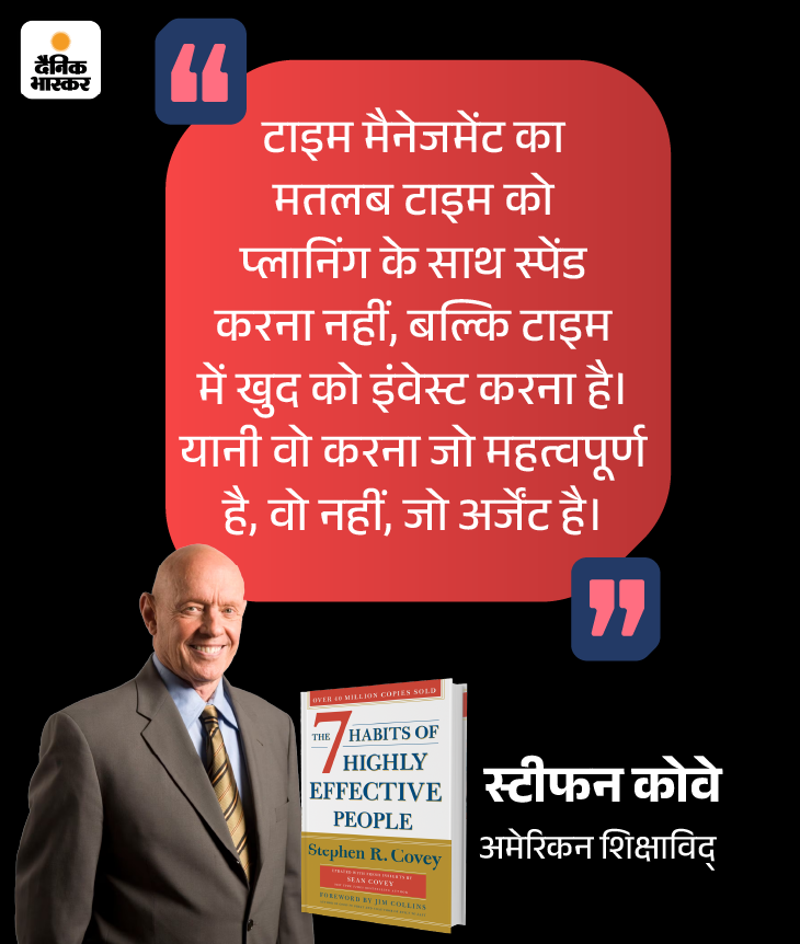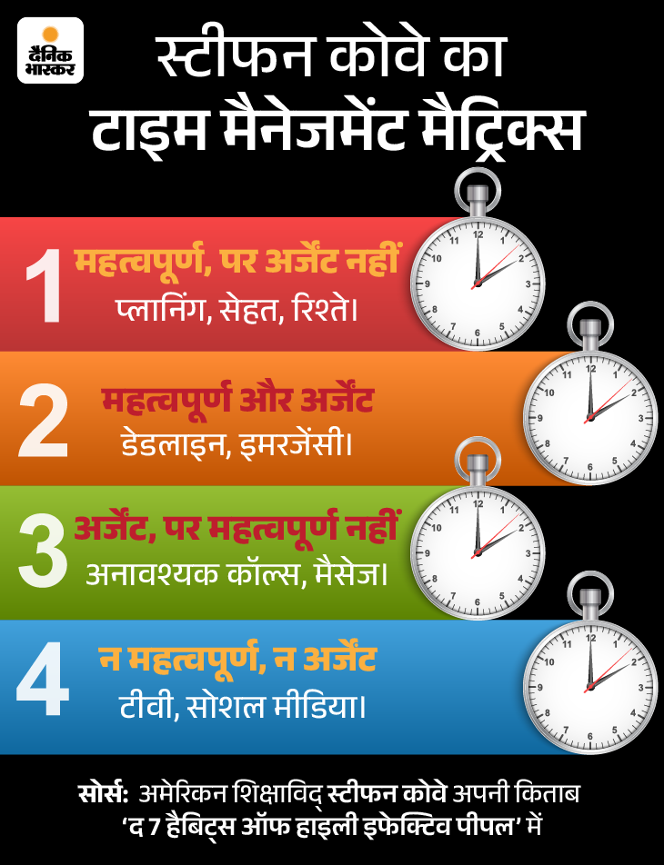 स्टीफन कोवे ने टाइम मैनेजमेंट को आसान बनाने के लिए एक खास तरीका बताया है, जिसे ‘टाइम मैनेजमेंट मैट्रिक्स’ कहते हैं। इसमें उन्होंने हमारे सभी कामों को 4 हिस्सों में बांटा है। ग्राफिक में देखिए-