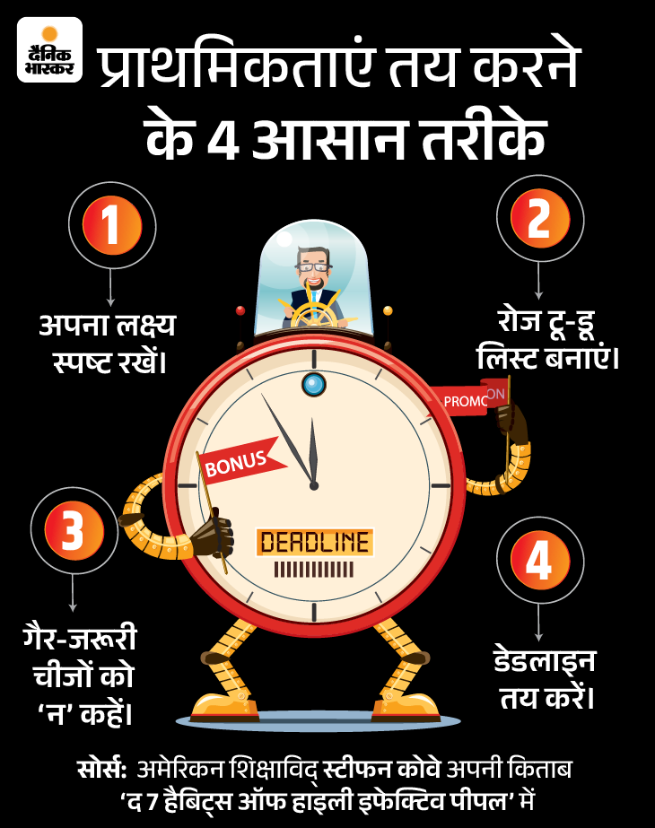 - पहले यह जानें कि आप जिंदगी में क्या चाहते हैं। क्या आप नौकरी में तरक्की करना चाहते हैं? या अपने परिवार के साथ ज्यादा वक्त बिताना चाहते हैं? जब लक्ष्य साफ होंगे, तो प्राथमिकताएं भी साफ हो जाएंगी। अगर आपका सपना है एक बिजनेस शुरू करना, तो हर दिन उसके लिए थोड़ा वक्त निकालें।