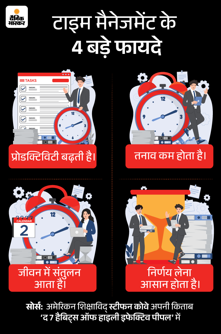 क्या आपने कभी सोचा है कि कुछ लोग दिन में इतने सारे काम कैसे कर लेते हैं। जब हम इतने काम करना चाहते हैं हमेशा समय कम क्यों पड़ जाता है? क्या उनके पास कोई जादुई छड़ी है? नहीं, उनका सीक्रेट है- टाइम मैनेजमेंट। ‘द 7 हैबिट्स ऑफ हाइली इफेक्टिव पीपल’ जैसी बेस्टसेलर किताब के लेखक स्टीफन कोवे कहते हैं कि, “सफल लोग समय को नहीं, बल्कि अपनी प्राथमिकताओं को मैनेज करते हैं।” इसका मतलब है कि टाइम मैनेजमेंट के लिए सिर्फ घड़ी की सुइयों को नहीं देखना है। हमें यह समझने है कि हमारे लिए सबसे जरूरी क्या है?