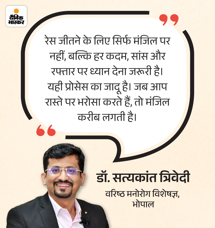 आप एक रेस में दौड़ रहे हैं। अगर आप सिर्फ फिनिश लाइन को देखते रहेंगे, तो शायद आप ठोकर खा जाएं या जल्दी थक जाएं। अगर आप अपनी हर सांस, हर कदम और अपनी रफ्तार पर ध्यान देंगे तो आप न सिर्फ रेस पूरी करेंगे।