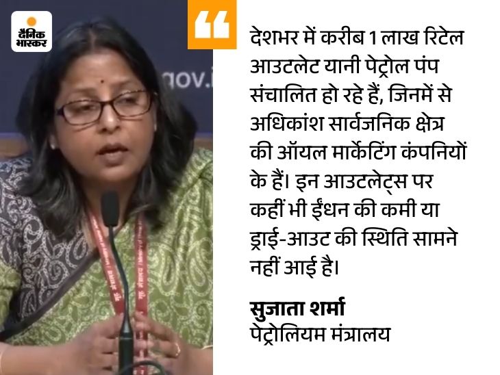 हालांकि उन्होंने यह भी स्पष्ट किया कि देश में कच्चे तेल की सप्लाई की स्थिति पूरी तरह संतोषजनक है और देश के करीब एक लाख पेट्रोल पंपों में से किसी पर भी ईंधन खत्म होने (ड्राई-आउट) की स्थिति नहीं है।