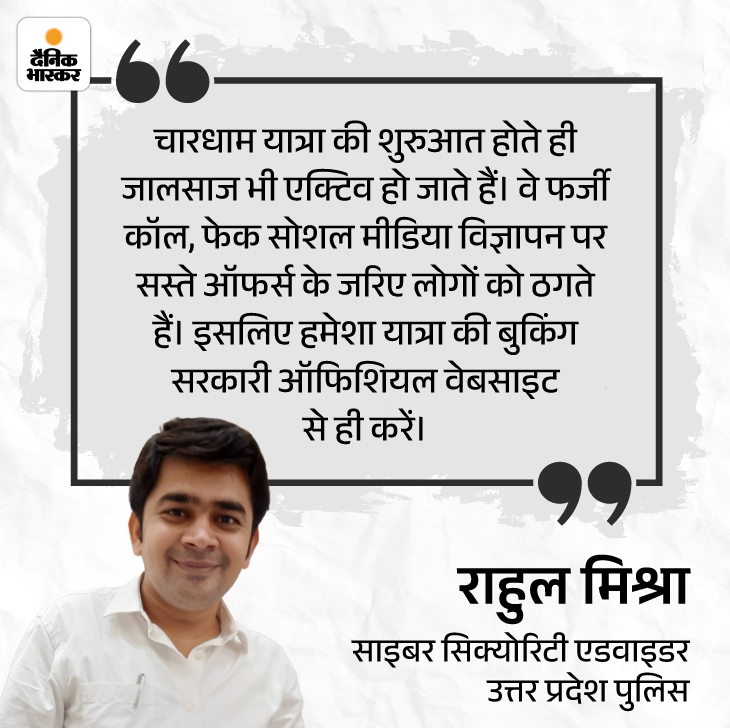 कई जालसाज चार धाम यात्रा के नाम पर नकली वेबसाइट और मोबाइल एप्स बनाते हैं, जो असली लगते हैं। इन पर ऑनलाइन बुकिंग, होटल, यात्रा पास या हेली सेवा देने का दावा किया जाता है, लेकिन पैसे लेने के बाद कोई सर्विस नहीं मिलती है।
