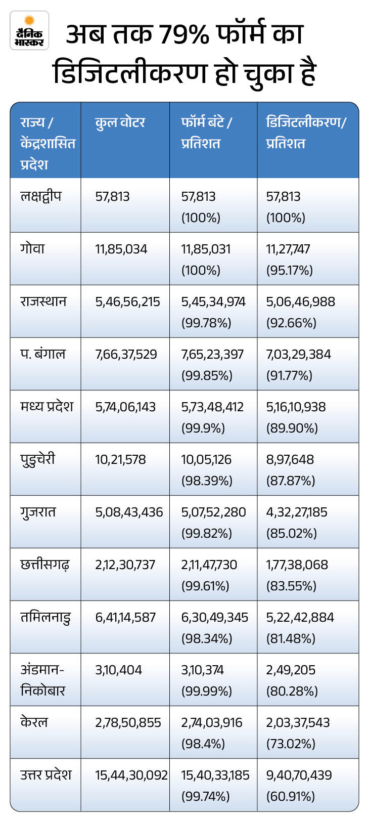 चुनाव आयोग ने अपनी प्रेस विज्ञप्ति में बताया कि 51 करोड़ मतदाताओं के लिए बनाए गए गणना फॉर्म में से 99.53% फॉर्म लोगों तक पहुंचा दिए गए हैं। इनमें से लगभग 79% फॉर्म का डिजिटलीकरण भी पूरा हो चुका है। यानी यानी घर-घर से BLO जो फॉर्म भरकर लाते हैं, उनमें लिखे नाम, पते और अन्य विवरण को ऑनलाइन सिस्टम में दर्ज किए जा चुके हैं।