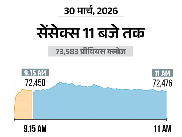 शेयर बाजार में आज यानी 30 मार्च को गिरावट है। सेंसेक्स करीब 1,000 अंक (1.50%) की गिरावट के साथ 72,500 पर आ गया है। वहीं निफ्टी में भी करीब 350 अंक (1.50%) की गिरावट है, ये 22,500 के स्तर पर कारोबार कर रहा है। आज ऑटो, मेटल और बैंकिंग शेयरों में ज्यादा बिकवाली है।