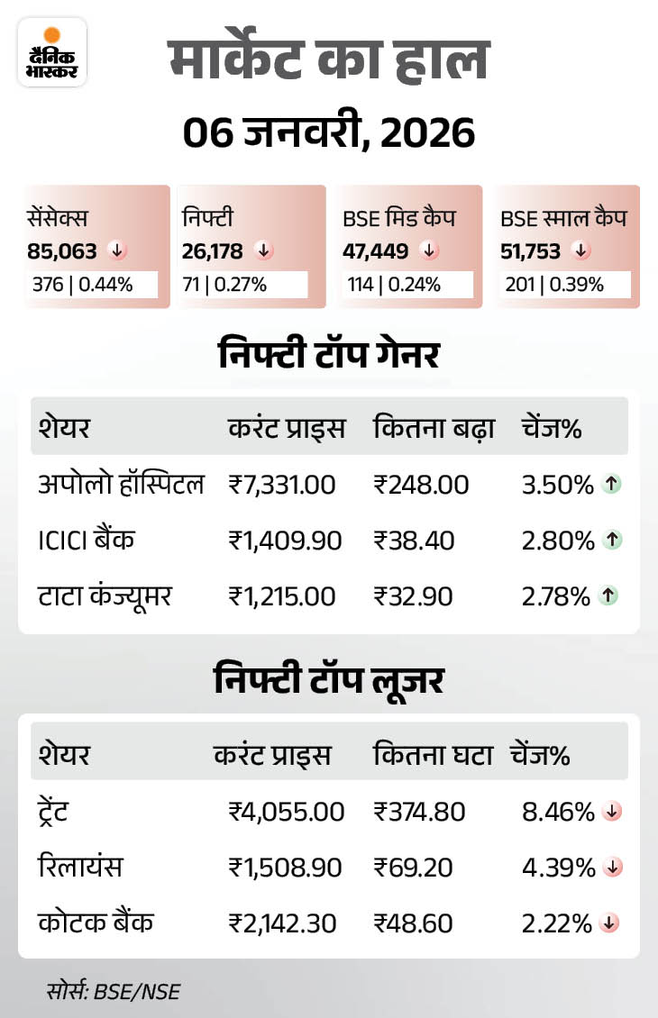 कल बाजार में रही थी गिरावट इससे पहले कल यानी 6 जनवरी को शेयर बाजार में गिरावट रही थी। सेंसेक्स 376 अंक गिरकर 85,063 के स्तर पर बंद हुआ था। निफ्टी में भी 71 अंक की गिरावट रही, ये 26,178 पर बंद हुआ था।