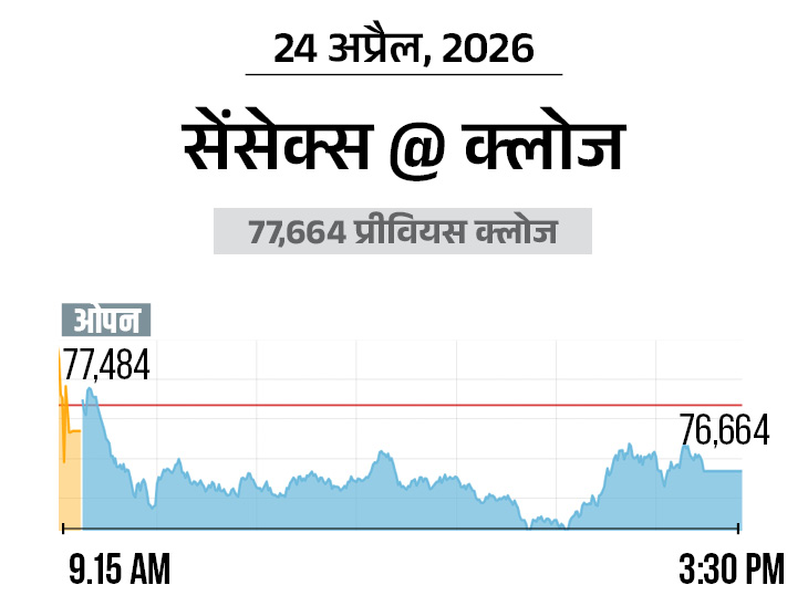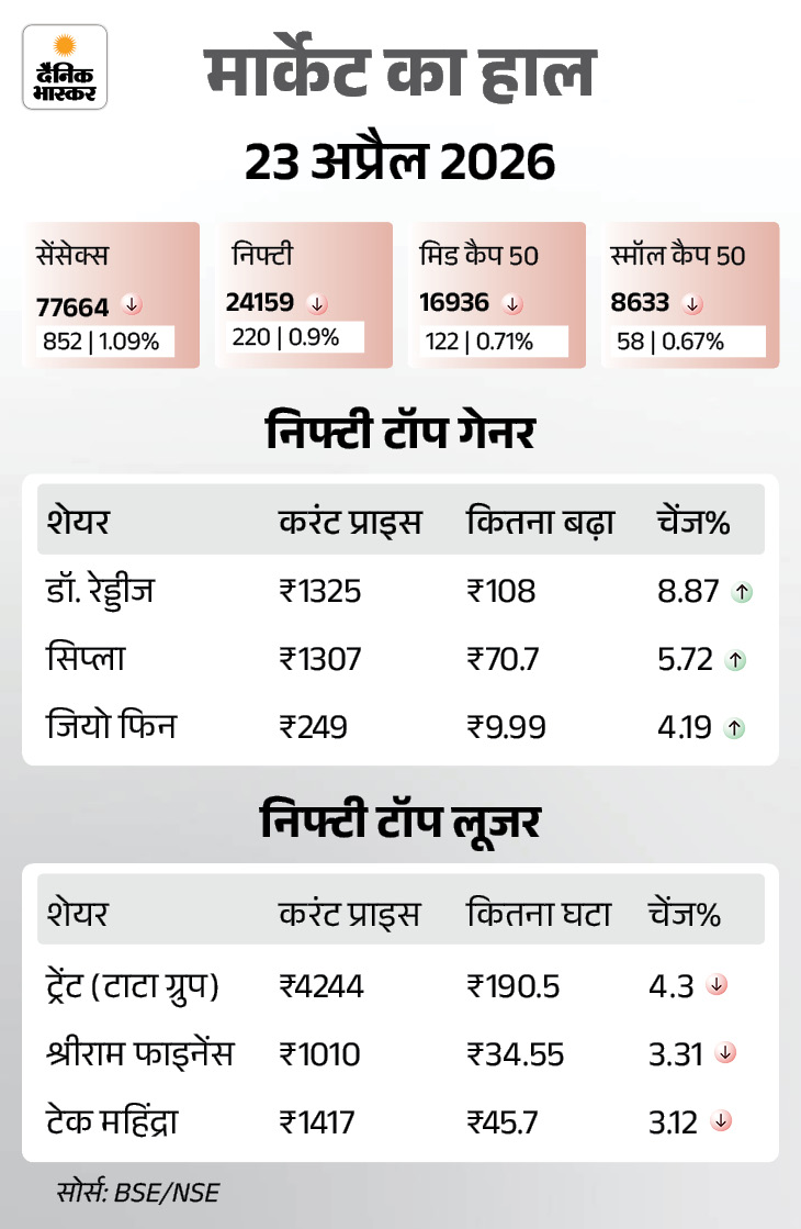 सेंसेक्स 23 अप्रैल को 852 अंक (1.09%) गिरकर 77,664 पर बंद हुआ। निफ्टी में भी 205 अंकों (0.84%) की गिरावट रही, ये 24,173 पर आ गया। कल के कारोबार में फार्मा और मीडिया शेयरों में खरीदारी रही, जबकि ऑटो में सबसे ज्यादा बिकवाली।