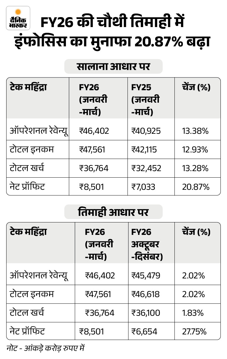 चौथी तिमाही के नतीजों के बाद इंफोसिस के शेयर में आज 6.92% से ज्यादा की गिरावट रही। ये 1,155 रुपए पर बंद हुआ। ये शेयर का 5 साल का निचला स्तर है। हालांकि, कंपनी का नेट प्रॉफिट सालाना आधार पर 21% बढ़कर ₹8,501 करोड़ रहा। पिछले साल इसी तिमाही में ₹7,033 करोड़ का मुनाफा हुआ था। ऑपरेशन्स से होने वाला रेवेन्यू करीब 13.38% बढ़ा है।