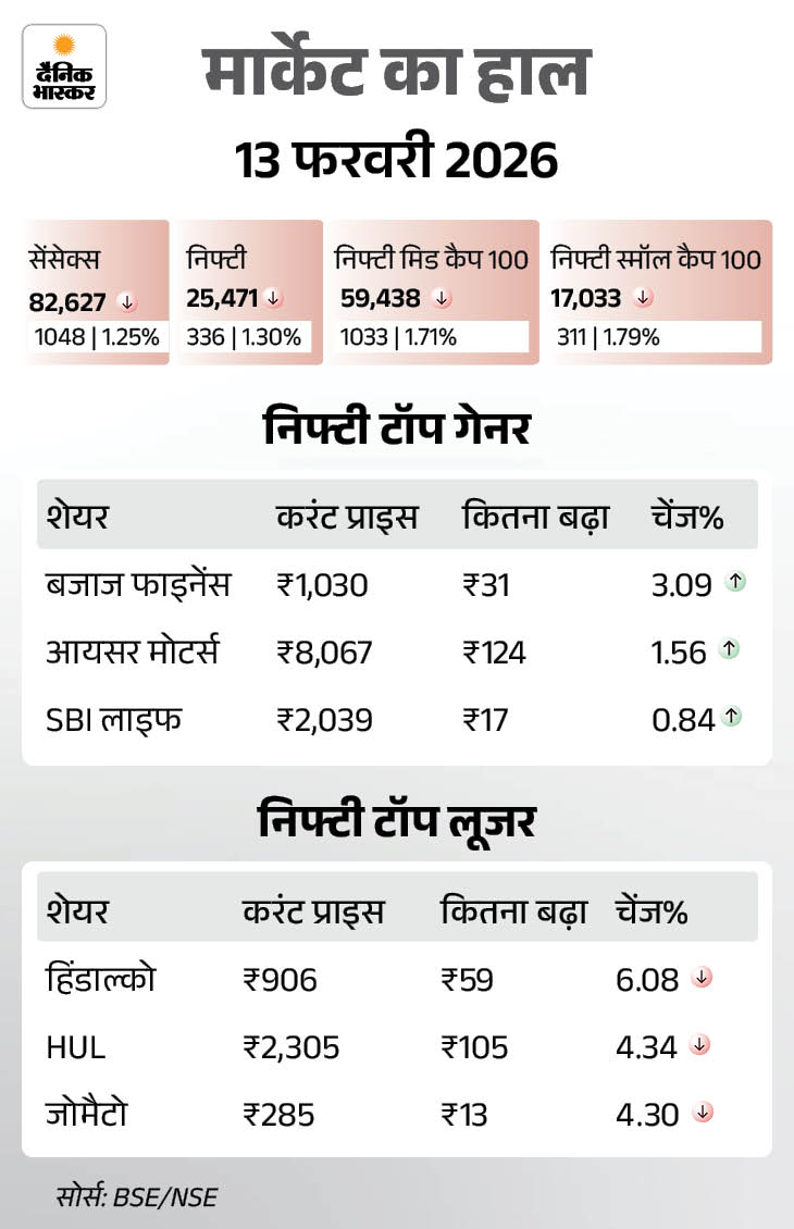 शेयर बाजार में आज यानी 13 फरवरी को गिरावट रही। सेंसेक्स 1048 अंक नीचे 82,627 पर बंद हुआ। वहीं निफ्टी में भी 336 अंक की गिरावट रही, ये 25,471 पर बंद हुआ।