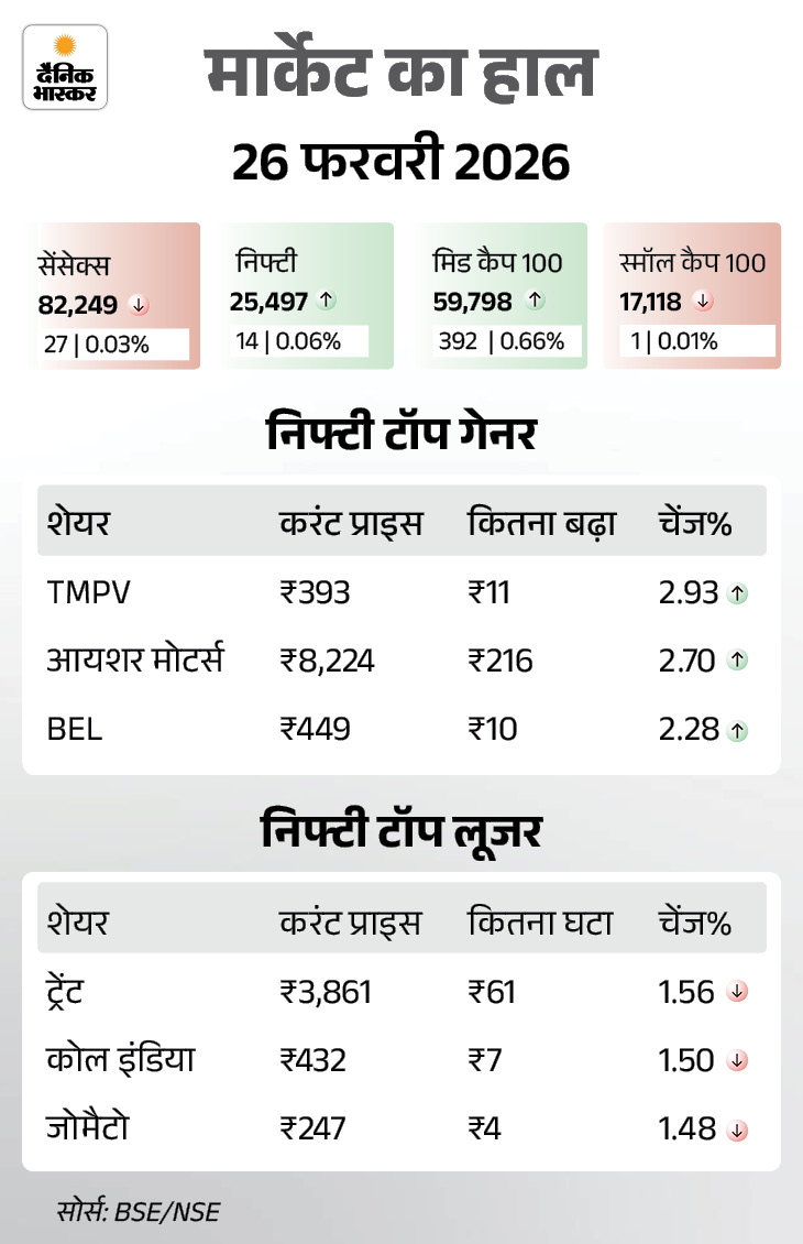 शेयर बाजार में कल यानी, 26 फरवरी को फ्लैट कारोबार रहा। सेंसेक्स 27 अंक गिरकर 82,249 पर बंद हुआ। निफ्टी में भी 14 अंकों की गिरावट रही। ये 25,497 के स्तर पर बंद हुआ। आज के कारोबार में फार्मा और सरकारी बैंक के शेयरों में तेजी रही है।