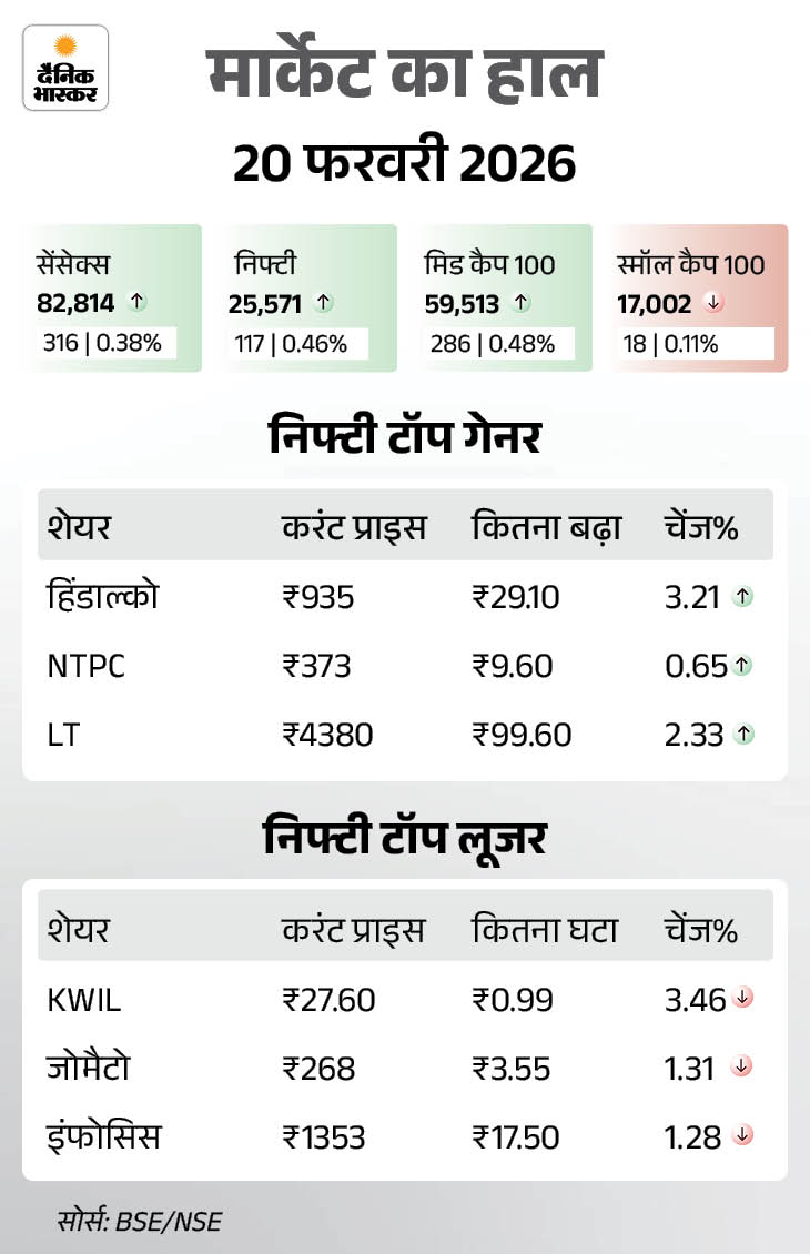 सेंसेक्स आज यानी शुक्रवार 20 फरवरी को 316 अंक (0.38%) चढ़कर 82,814 के स्तर पर बंद हुआ। निफ्टी भी 117 अंक (0.46%) चढ़ा। ये 25,571 के स्तर पर पहुंच गया। आज के कारोबार में मेटल और सरकारी बैंकों के शेयरों में खरीदारी है। आईटी में गिरावट है।