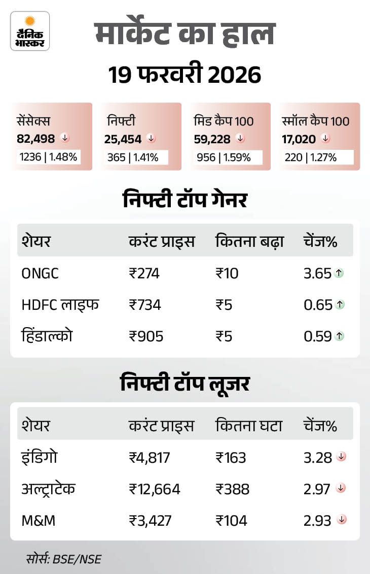 शेयर बाजार में कल यानी 19 फरवरी को गिरावट है। सेंसेक्स 1236 अंक (1.48%) की गिरावट के साथ 82,498 के स्तर पर बंद हुआ। निफ्टी में भी 365 अंक (1.41%) की गिरावट रही, ये 25,454 के स्तर पर बंद हुा। ऑटो, रियल्टी और बैंकिंग शेयर्स ज्यादा टूटे हैं।