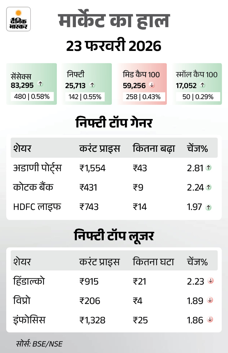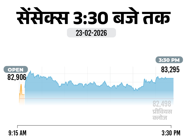 सेंसेक्स में आज यानी सोमवार 23 फरवरी को तेजी रही। ये 480 अंक (0.58%) चढ़कर 83,295 पर बंद हुआ। निफ्टी में भी 142 अंक (0.55%) की तेजी रही। ये 25,713 के स्तर पर बंद हुआ। आज के कारोबार में ऑटो और बैंकों के शेयरों में खरीदारी रही।