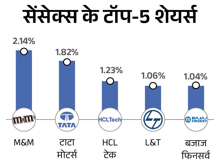 सेंसेक्स के 30 शेयरों में से 28 में तेजी, जबकि दो में गिरावट रही। जोमैटो, पावर ग्रिड, ITC और बजाज फिनसर्व के शेयरों में 3.5% तक की तेजी रही। नेस्ले इंडिया समेत कुल 14 शेयरों में 1.8% तक की तेजी रही। सनफार्मा और एयरटेल 1.8% तक फिसले।
