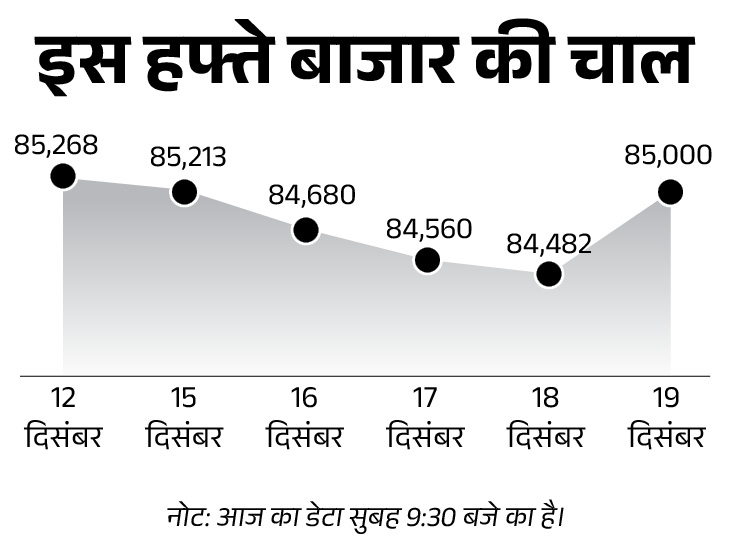 लगातार चार दिन की गिरावट के बाद शेयर बाजार में आज यानी शुक्रवार 19 दिसंबर तेजी है। सेंसेक्स 500 अंक चढ़कर 85,000 पर कारोबार कर रहा है। निफ्टी में भी 150 अंक की तेजी है, ये 25,970 के स्तर पर है।