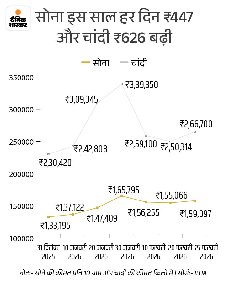इस साल सोने-चांदी की कीमत में लगातार उतार-चढ़ाव देखने को मिल रहा है। सोना 2026 में अब तक 25,902 रुपए और चांदी 36,280 रुपए महंगी हो चुकी है। इस दौरान 29 जनवरी को सोने ने 1.76 लाख रुपए और चांदी ने 3.86 लाख रुपए का ऑलटाइम हाई भी बनाया था।