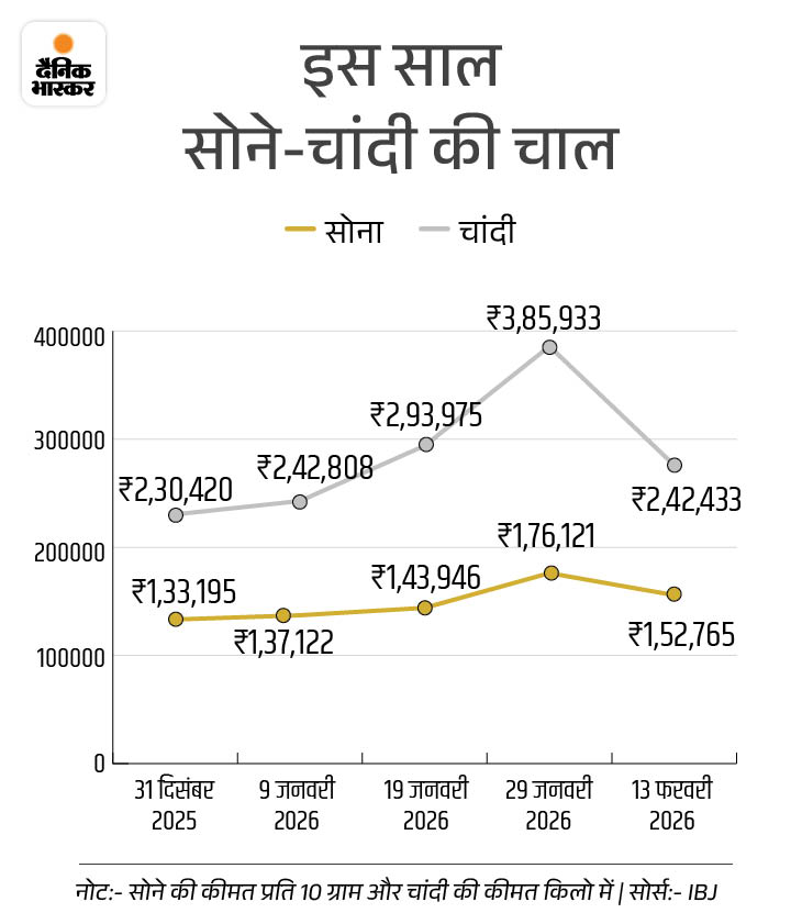 इस साल सोने-चांदी की कीमत में लगातार उतार-चढ़ाव देखने को मिल रहा है। सोना 2026 में अब तक 21,375 और चांदी 14,352 महंगी हो चुकी है। इस दौरान 29 जनवरी को सोने ने 1.76 लाख रुपए और चांदी ने 3.86 लाख रुपए का ऑल टाइम हाई भी बनाया था।