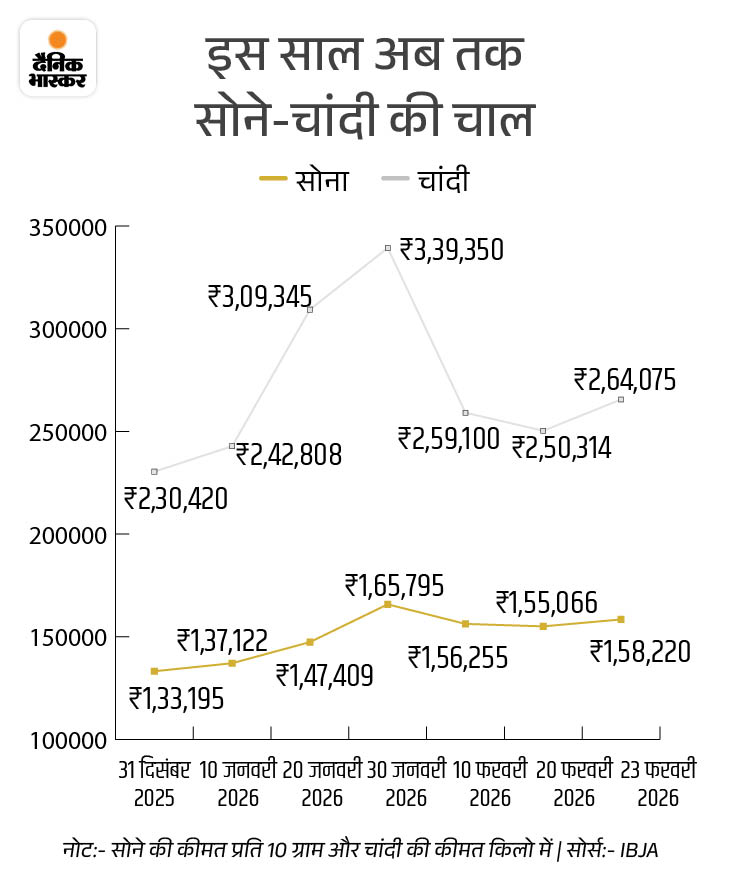 इस साल सोना 23,000 रुपए और चांदी 33,000 रुपए महंगी हुई इस साल सोने-चांदी की कीमत में लगातार उतार-चढ़ाव देखने को मिल रहा है। सोना 2026 में अब तक 24,000 रुपए और चांदी 33,000 रुपए महंगी हो चुकी है। इस दौरान 29 जनवरी को सोने ने 1.76 लाख रुपए और चांदी ने 3.86 लाख रुपए का ऑल टाइम हाई भी बनाया था।