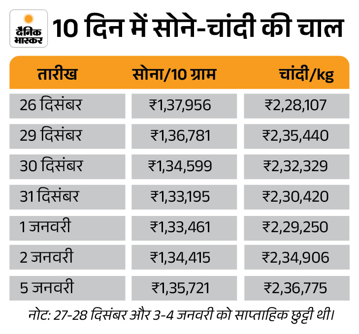 वहीं, एक किलो चांदी की कीमत 2,225 रुपए बढ़कर 2,36,775 रुपए पर आ गई है। इससे पहले इसकी कीमत 2,34,550 रुपए किलो थी। इससे पहले 29 दिसंबर 2025 को सोना 1,38,161 रुपए और चांदी 2,43,483 रुपए के ऑल टाइम हाई पर पहुंच गई थी।