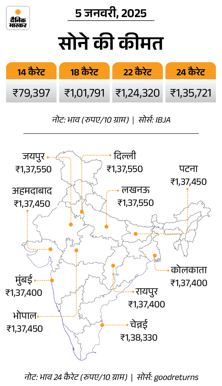 - पिछले साल यानी 2025 में सोने की कीमत 57,033 रुपए (75%) बढ़ी है। 31 दिसंबर 2024 को 10 ग्राम 24 कैरेट सोना 76,162 रुपए का था, जो 31 दिसंबर 2025 को 1,33,195 रुपए हो गया।