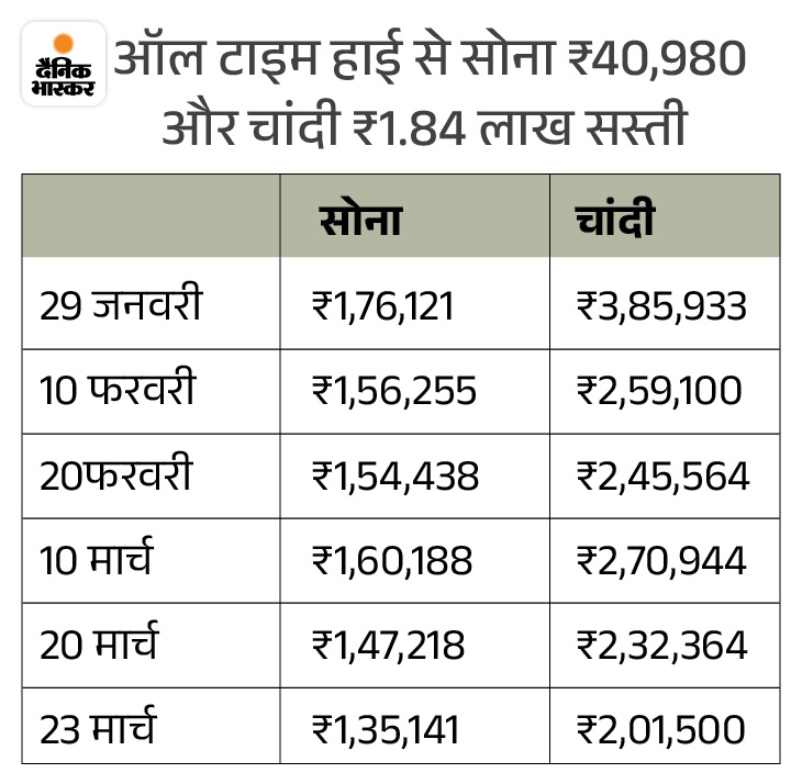 सोने-चांदी की कीमतों में आज 23 मार्च को गिरावट रही। इंडिया बुलियन एंड ज्वेलर्स एसोसिएशन (IBJA) के मुताबिक, 10 ग्राम 24 कैरेट सोना सुबह 12,077 रुपए घटकर 1.35 लाख रुपए पर खुला, लेकिन शाम को 7,649 रुपए की गिरावट के साथ 1.40 लाख रुपए पर बंद हुआ। इससे पहले इसकी कीमत 1.47 लाख थी।