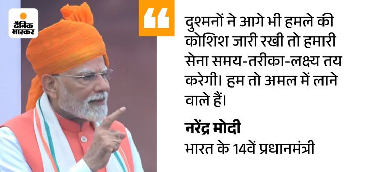 1. ऑपरेशन सिंदूर में सेना को खुली छूट दी: ‘आज मुझे लाल किले की प्राचीर से ऑपरेशन सिंदूर के वीर जांबाजों को सैल्यूट करने का अवसर मिला है। हमारे सैनिकों ने दुश्मनों को उनकी कल्पना से परे सजा दी है। 22 अप्रैल को पहलगाम में सीमा पार से आतंकियों ने जिस प्रकार का कत्ले आम किया। धर्म पूछकर लोगों को मारा। पूरा हिंदुस्तान आक्रोश से भरा हुआ था। पूरा विश्व इस संहार से चौंक गया था। ऑपरेशन सिंदूर उसी आक्रोश की अभिव्यक्ति है।