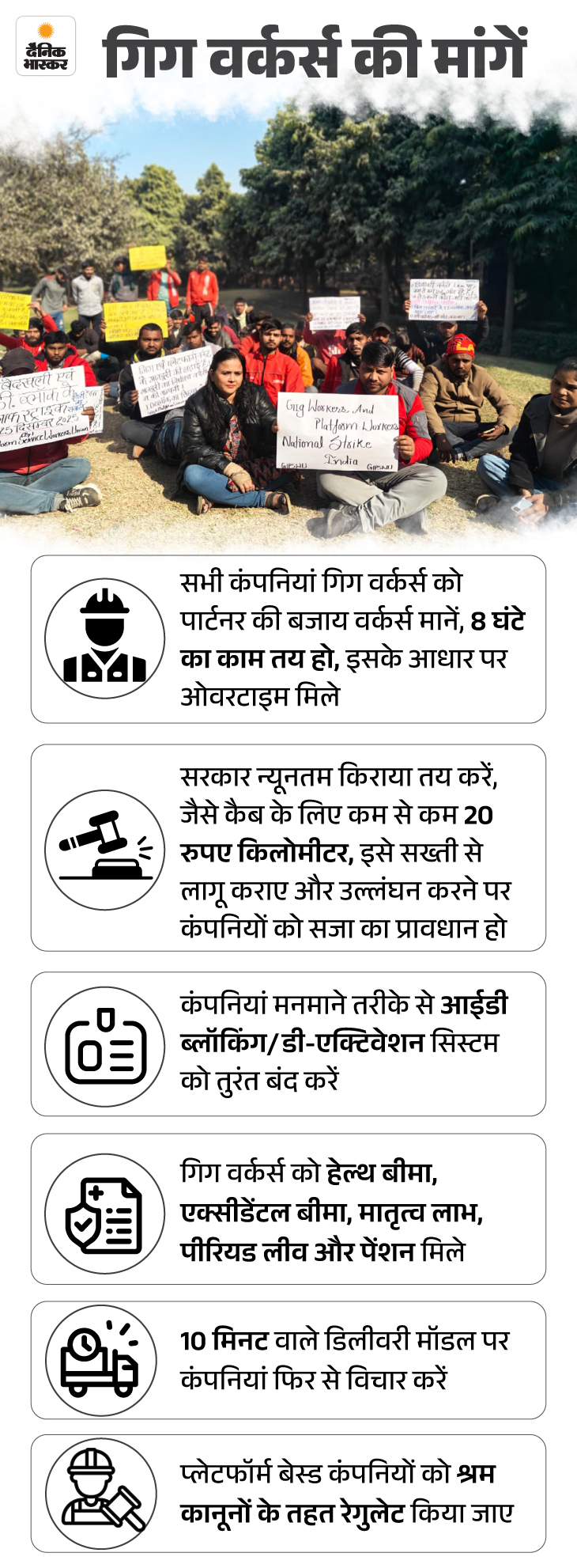 कम कमाई और 10 मिनट में डिलीवरी के प्रेशर से परेशान गिग वर्कर्स ने न्यू ईयर से पहले 31 दिसंबर को हड़ताल की थी, जिसमें स्विगी, जोमैटो, ब्लिंकिट, जेप्टो जैसी कंपनियों के राइडर्स शामिल थे। इससे पहले गिग वर्कर्स ने 25 दिसंबर को क्रिसमस पर भी हड़ताल की थी। इन हड़ताल में गिग वर्कर्स ने 10 मिनट में डिलीवरी मॉडल को खत्म करने समेत कई मांगें की थीं।