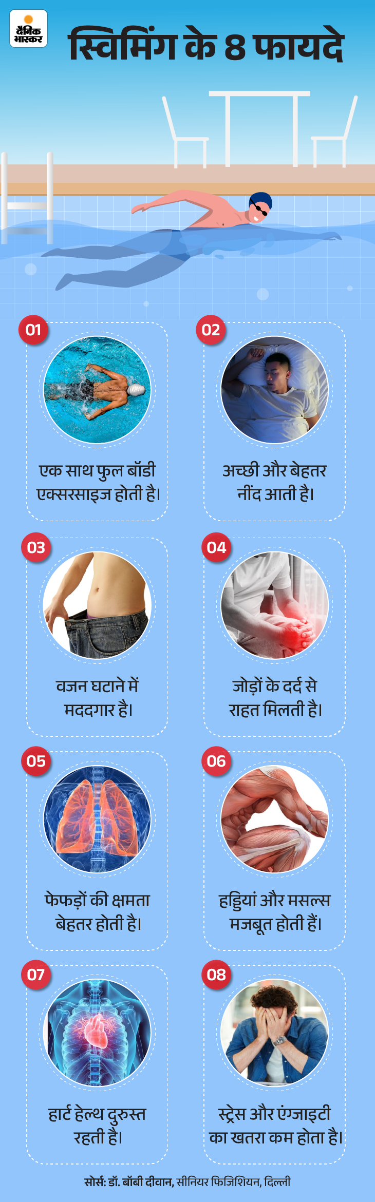 नियमित स्विमिंग से बेहतर नींद में आती है। हार्वर्ड यूनिवर्सिटी की एक रिसर्च के मुताबिक, स्विमिंग शरीर और मन दोनों को स्वस्थ रखती है। वहीं ‘साइंस डायरेक्ट’ में पब्लिश एक स्टडी के मुताबिक, स्विमिंग से लंग्स मजबूत होते हैं। स्विमिंग के और कई हेल्थ बेनिफिट्स हैं। इसे नीचे दिए ग्राफिक से समझिए-