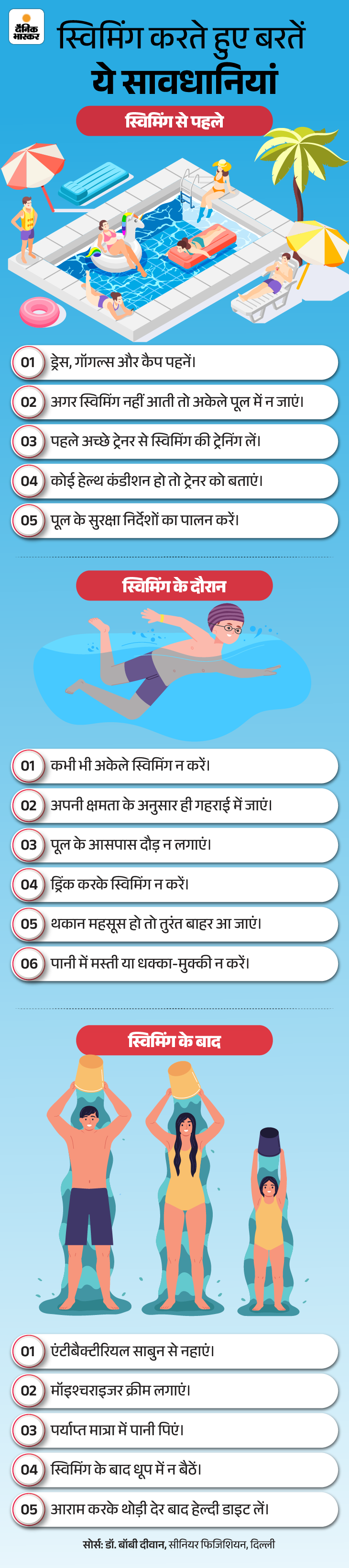 जवाब- स्विमिंग को सुरक्षित और फायदेमंद बनाने के लिए कुछ सावधानियां बरतना बहुत जरूरी हैं। इसे नीचे दिए ग्राफिक से समझिए-