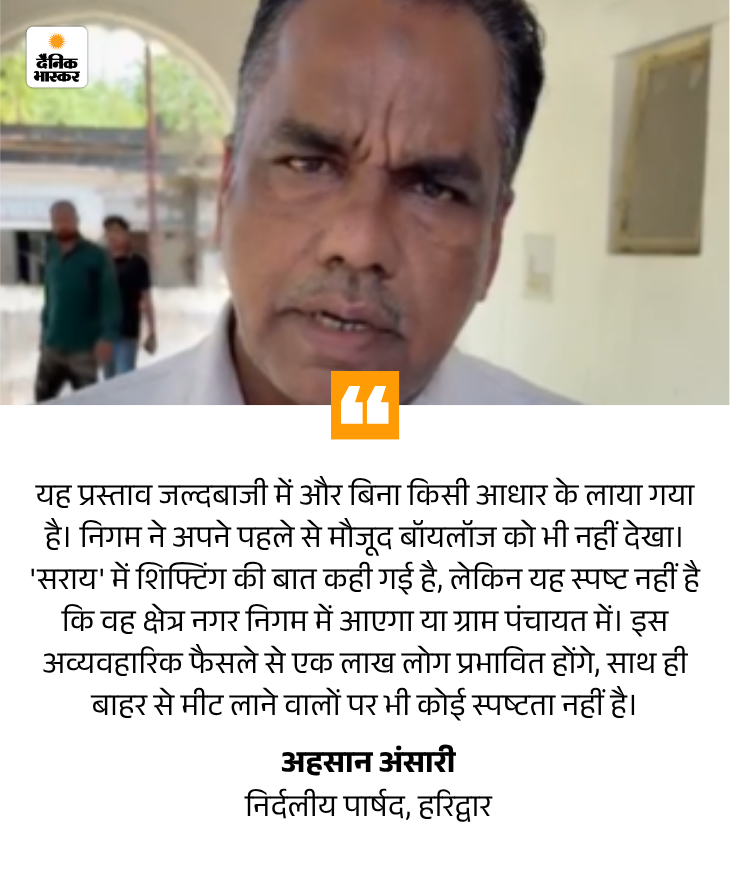 हरिद्वार नगर निगम के कुल 60 पार्षदों में से आज 30 से ज्यादा पार्षद बैठक में मौजूद रहे। मीट पर प्रतिबंध और दुकानों को शिफ्ट करने का प्रस्ताव मेयर किरण जैसल ने रखा था, जिसे सदन ने हरी झंडी दे दी।