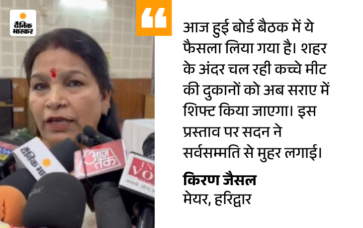 हरिद्वार में अब मीट की दुकानें नहीं खुलेंगी। इसे लेकर नगर निगम की बैठक में सोमवार को प्रस्ताव पास हो गया है। इसमें मीट की दुकानों को शहर से बाहर शिफ्ट करने का फैसला लिया गया। नगर निगम की बोर्ड बैठक में पार्षदों ने सर्वसम्मति से यह प्रस्ताव पास कराया