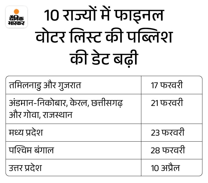 राजस्थान को भी शनिवार को अंतिम सूची जारी करनी थी, लेकिन पब्लिश डेट बढ़ाकर 21 फरवरी कर दी गई है। इससे पहले पश्चिम बंगाल की भी डेडलाइन बढ़ाकर 28 फरवरी और यूपी की 10 अप्रैल कर दी गई थी।