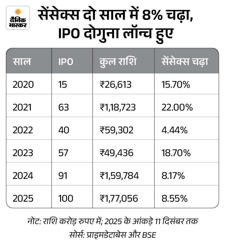 IPO यानी इनिशियल पब्लिक ऑफरिंग के मामले में 18 साल बाद 2025 में बना रिकॉर्ड अगले ही साल 2026 में टूटने के पूरे आसार हैं। इस साल अब तक करीब 100 कंपनियों ने मेनबोर्ड आईपीओ से रिकॉर्ड 1.77 लाख करोड़ रुपए जुटाए। यह 2007 के बाद सबसे ज्यादा है। पर 2026 में 192 कंपनियां 2.56 लाख करोड़ रुपए जुटा सकती हैं।
