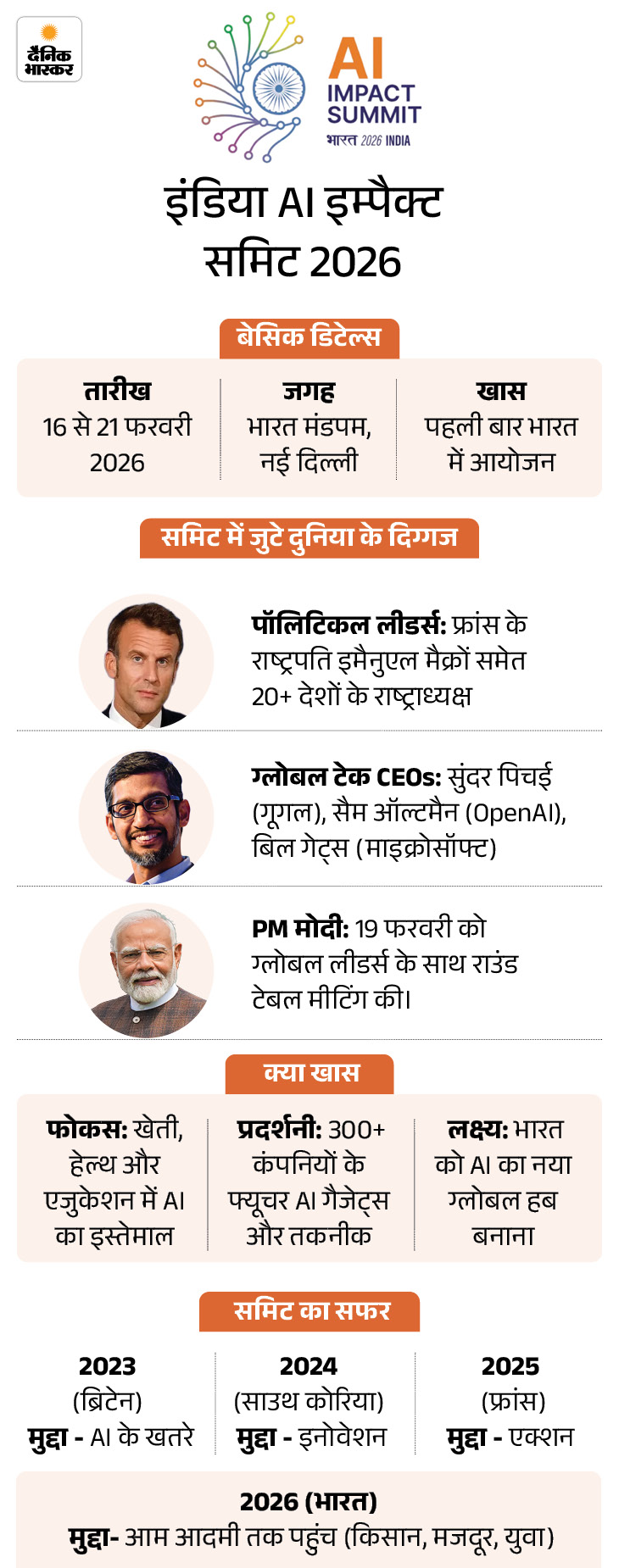प्रधानमंत्री नरेंद्र मोदी ने 16 फरवरी को समिट का उद्घाटन किया था। यहां दुनियाभर की कंपनियों ने अपने लेटेस्ट AI सॉल्यूशंस को दुनिया के सामने पेश किया है। यहां आम लोग देख सकते हैं कि AI असल जिंदगी में कैसे काम करता है और भविष्य में AI से खेती, सेहत और शिक्षा जैसे क्षेत्रों में क्या बदलाव लाने वाला है।