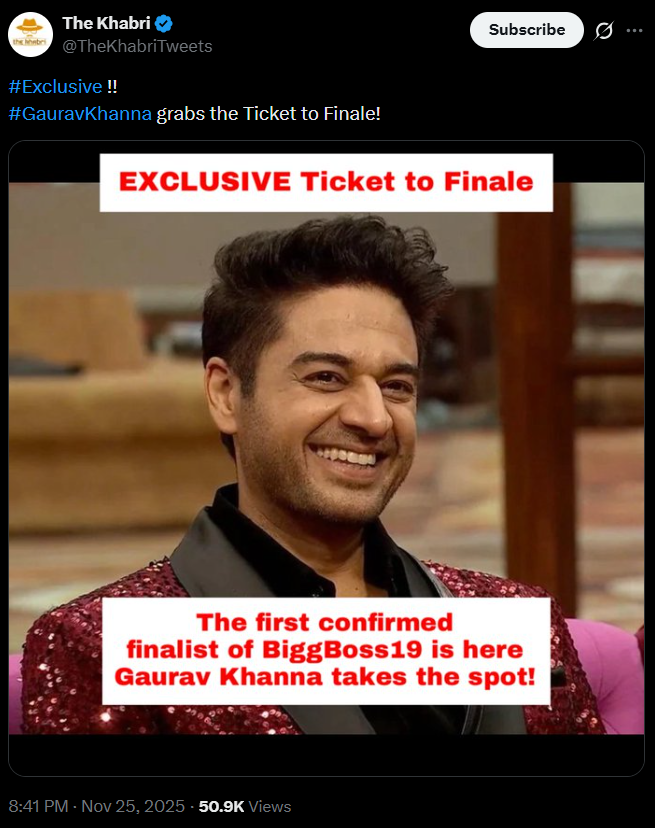 दरअसल, बिग बॉस से जुड़ी हर अपडेट देने वाले द खबरी ने अपने सोशल मीडिया पर टिकट टू फिनाले के विजेता का नाम गौरव खन्ना बताया। उनके अनुसार, गौरव फिनाले वीक में एंट्री करने वाले पहले सदस्य बन गए हैं और बिग बॉस 19 के आखिरी कैप्टन भी। इसके साथ ही उन्हें एक खास पावर भी मिली है। पहले वह नॉमिनेटेड थे, लेकिन फिनाले का टिकट मिलने के बाद वह सुरक्षित हो गए हैं और उन्हें ग्रैंड फिनाले में डायरेक्ट एंट्री मिल गई है।