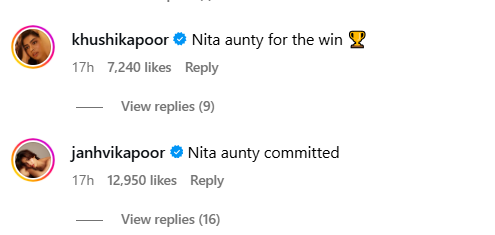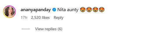 कमेंट सेक्शन में कई स्टार्स ने प्रतिक्रिया दी। अनन्या पांडे ने लिखा – “नीता आंटी।” वहीं खुशी कपूर और जान्हवी कपूर ने भी नीता अंबानी का नाम लिया।