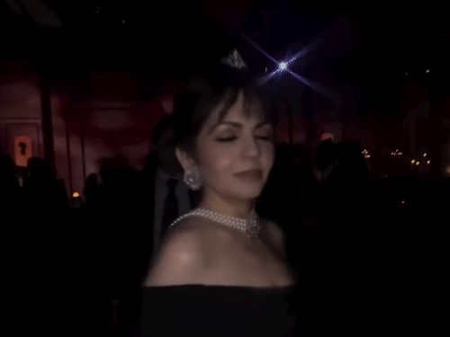 इसके बाद एंट्री होती है नीता अंबानी की, जो फिल्म ब्रेकफास्ट ऐट टिफनीज की ऑड्री हेपबर्न के लुक में नजर आईं। उन्होंने ब्लैक ऑफ-शोल्डर ड्रेस, डायमंड टियारा और क्लासिक हेयरस्टाइल की थी।
