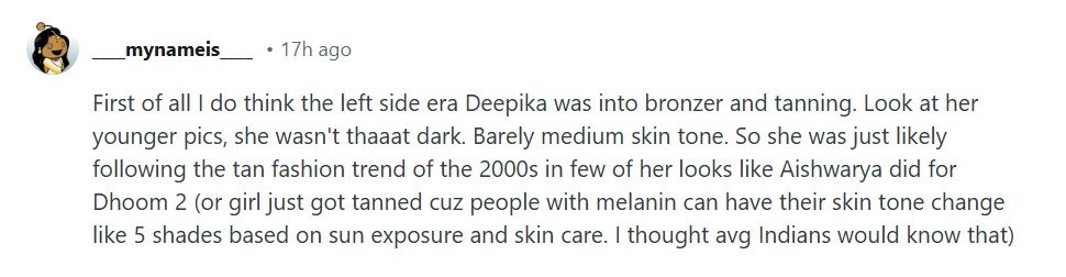 एक फैन लिखा-‘उसकी बचपन की तस्वीरें देखो, वो इतनी सांवली नहीं थी। मुश्किल से मीडियम स्किन टोन था। तो शायद वो 2000 के दशक के टैनिंग फैशन ट्रेंड को फॉलो कर रही थीं, जैसे ऐश्वर्या ने धूम 2 के लिए किया था।’