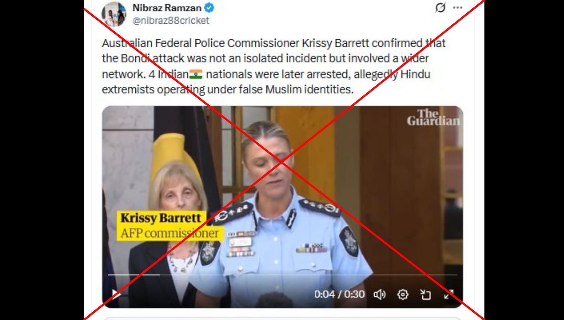 निबराज रमजान (@Nibraj88cricket) नाम के एक्स यूजर ने लिखा, “ऑस्ट्रेलियाई संघीय पुलिस आयुक्त क्रिसी बैरेट ने पुष्टि की कि बॉन्डी हमला कोई अलग-थलग घटना नहीं थी, बल्कि इसमें एक व्यापक नेटवर्क शामिल था। बाद में चार भारतीय नागरिकों को गिरफ्तार किया गया, जिन पर हिंदू चरमपंथियों के रूप में फर्जी मुस्लिम पहचान का इस्तेमाल करने का आरोप है। पोस्ट का लिंक आप यहां और आर्काइव लिंक यहां देख सकते हैं।