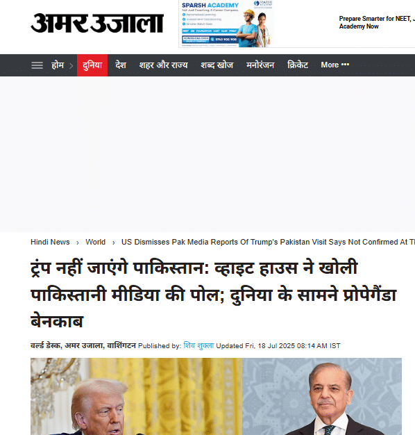 इसके बाद हमने अमर उजाला के न्यूज डेस्क से संपर्क किया। इस दौरान हमें एक रिपोर्ट मिली। यह रिपोर्ट 18 जुलाई 2025 को प्रकाशित की गई है। रिपोर्ट में बताया गया है कि अमेरिका के राष्ट्रपति डोनाल्ड ट्रंप के पाकिस्तान दौरे को लेकर पाकिस्तानी मीडिया के दावों को व्हाइट हाउस ने शुक्रवार को सिरे से खारिज कर दिया। इसके बाद पाकिस्तान का झूठ एक बार फिर दुनिया के सामने आ गया है। व्हाइट हाउस ने ट्रंप की यात्रा योजना को लेकर साफ कहा कि फिलहाल राष्ट्रपति की पाकिस्तान यात्रा की कोई योजना नहीं है।