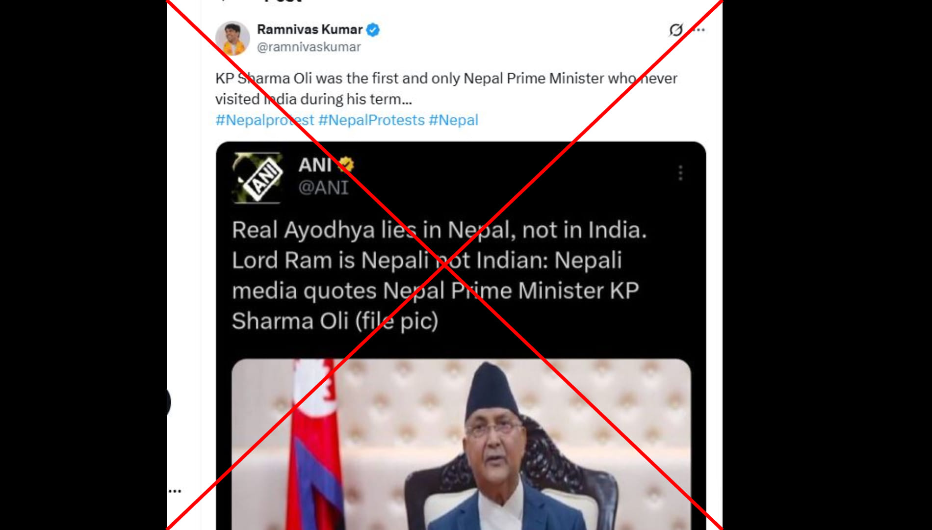रामनिवास कुमार (@ramnivaskumar) नाम के एक्स यूजर ने लिखा, “केपी शर्मा ओली नेपाल के पहले और एकमात्र प्रधानमंत्री थे जिन्होंने अपने कार्यकाल के दौरान कभी भारत का दौरा नहीं किया…।“ पोस्ट का लिंक आप यहां और आर्काइव लिंक यहां देख सकते हैं।