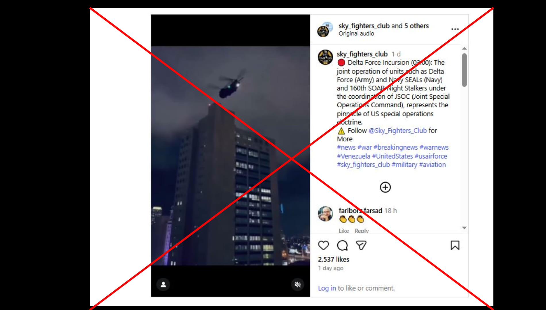 स्काई फाइटर्स क्लब नाम के इंस्टाग्राम यूजर ने लिखा,”डेल्टा फोर्स घुसपैठ (03:00): जेएसओसी (संयुक्त विशेष अभियान कमान) के समन्वय के तहत डेल्टा फोर्स (सेना) और नेवी सील्स (नौसेना) और 160वीं एसओएआर नाइट स्टॉकर जैसी इकाइयों का संयुक्त अभियान, अमेरिकी विशेष अभियान सिद्धांत के शिखर का प्रतिनिधित्व करता है।” पोस्ट का लिंक आप यहां और आर्काइव लिंक यहां देख सकते हैं।