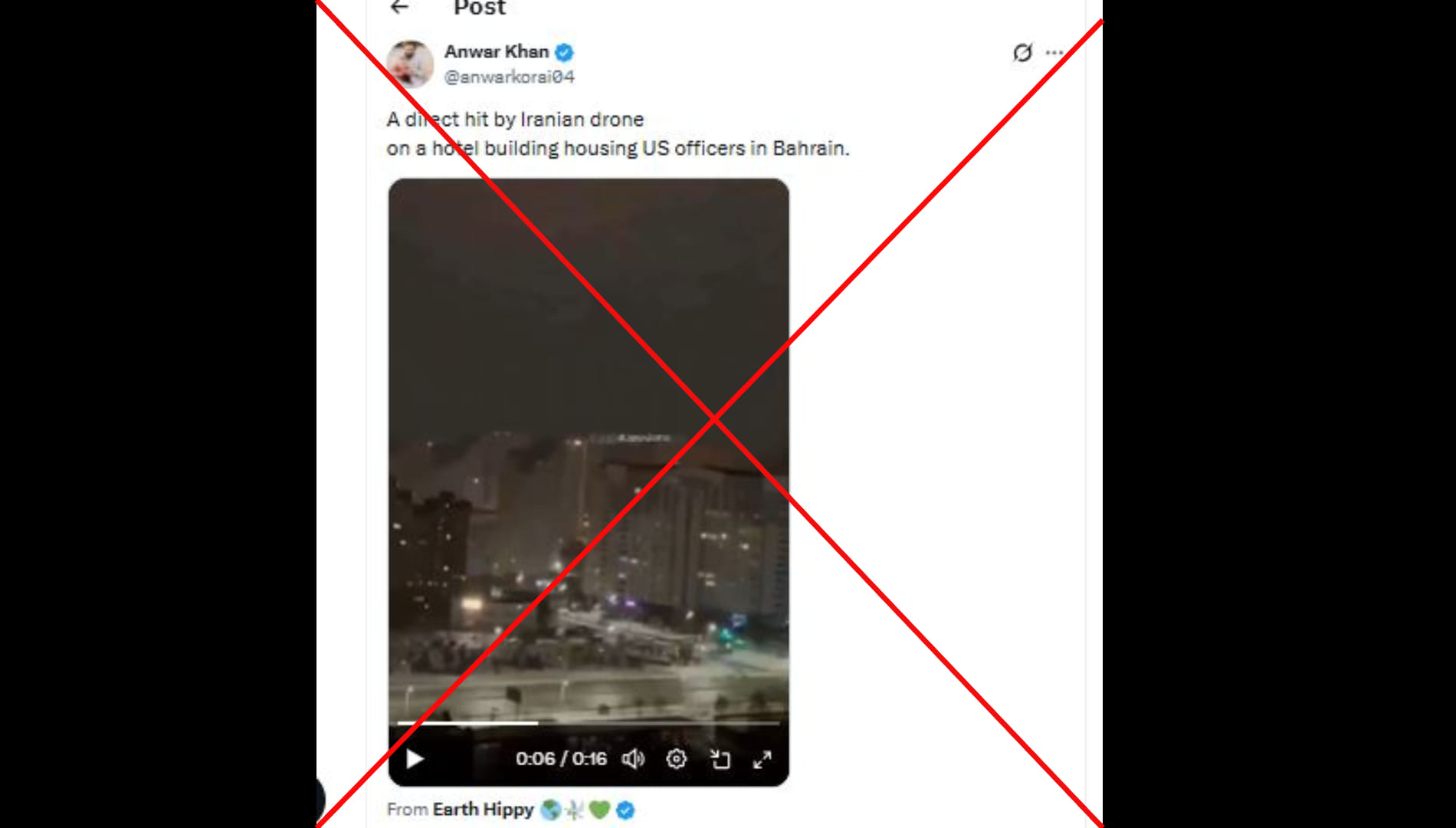 अनवर खान नाम के एक्स यूजर ने लिखा, ”बहरीन में अमेरिकी अधिकारियों के आवास वाले एक होटल पर ईरानी ड्रोन द्वारा सीधा हमला।” पोस्ट का लिंक आप यहां और आर्काइव लिंक यहां देख सकते हैं।