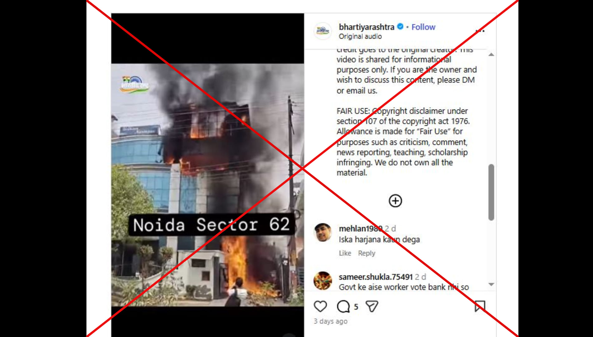 इस दावे की पड़ताल करने के लिए हमने सबसे पहले वीडियो के कीफ्रेम को गूगल रिवर्स इमेज पर सर्च किया। इस दौरान हमें pgcgzb नाम के इंस्टाग्राम अकाउंट पर वायरल वीडियो देखने को मिला। यह वीडियो 1 जून 2024 को साझा किया गया है। वहीं, यहां बताया गया है कि नोएडा सेक्टर 62 में आग।