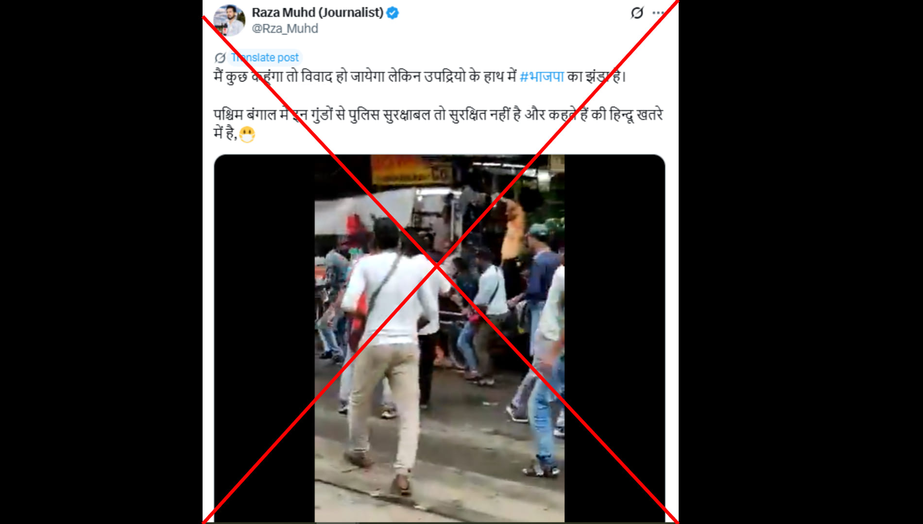 रजा मुहम्मद (@Rza_Muhd) नाम के एक्स यूजर ने लिखा “मैं कुछ कहूंगा तो विवाद हो जायेगा लेकिन उपद्रियो के हाथ में भाजपा का झंडा है। पश्चिम बंगाल में इन गुंडों से पुलिस सुरक्षाबल तो सुरक्षित नहीं है और कहते हैं की हिन्दू खतरे में है।” पोस्ट का लिंक आप यहां और आर्काइव लिंक यहां देख सकते हैं।