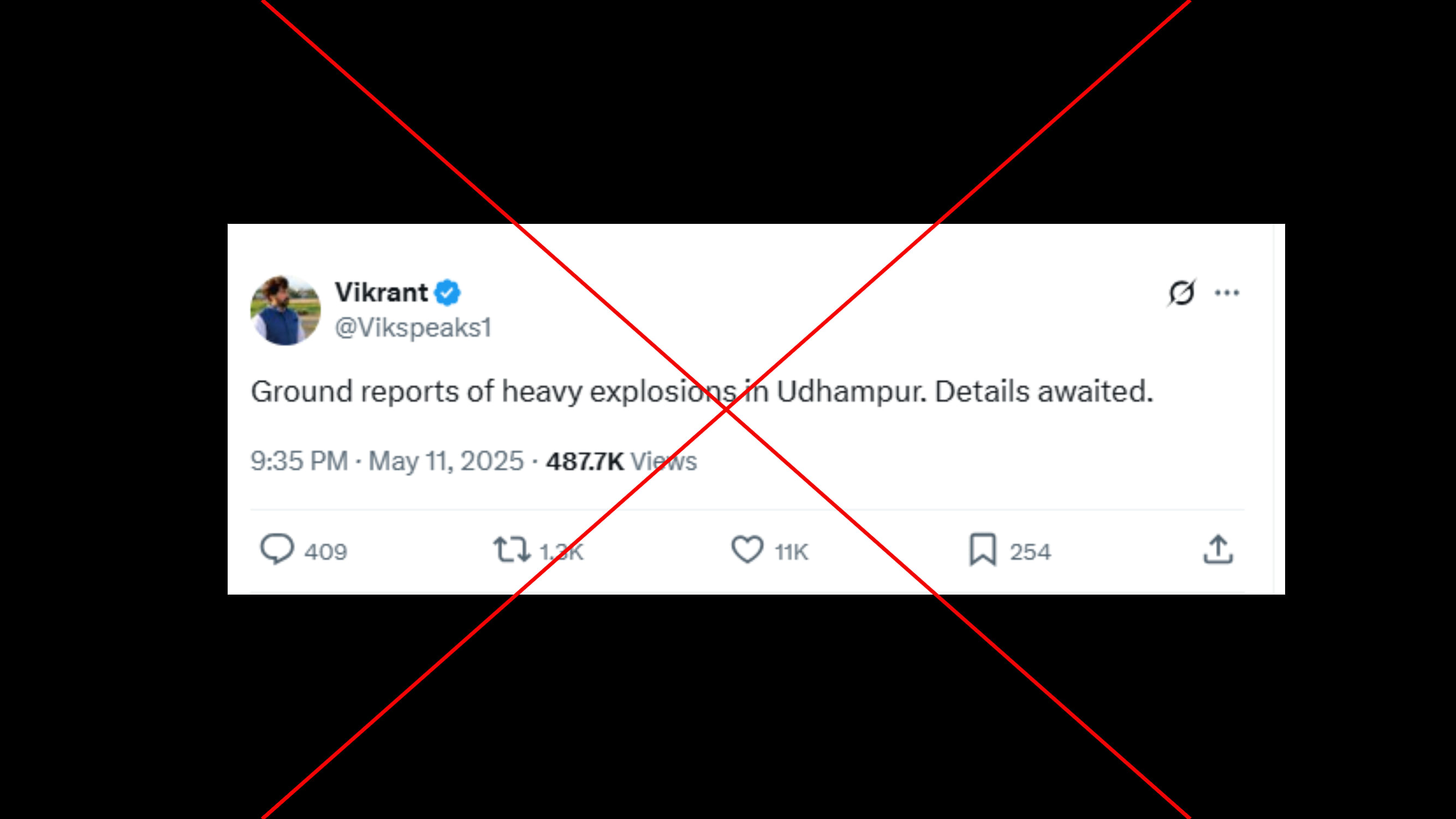 11 मई 2025 को विक्रांत नाम के एक एक्स यूजर ने पोस्ट करते हुए लिखा कि उधमपुर में भारी विस्फोट की खबरें आ रही है, जिसकी अधिक जानकारी के लिए अभी इंतजार किया जा रहा है। ये पोस्ट तब सामने आया था जब भारत और पाकिस्तान की तरफ से सीजफायर की घोषणा कर दी गई थी।